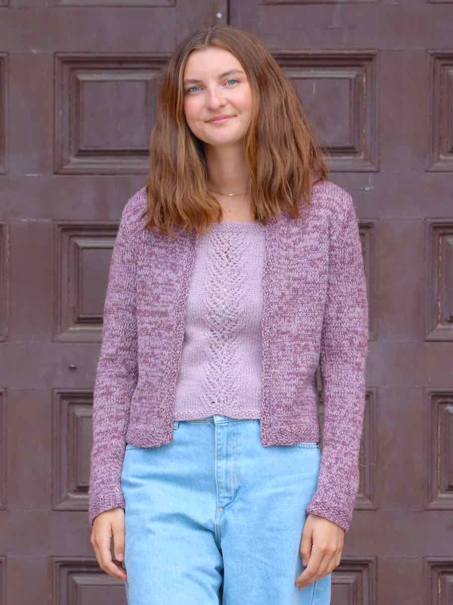 Koftan och linnet är stickade i dubbelt garn. Linnet är stickat på rundsticka nerifrån och upp och har en mönsterbård fram. Koftan är stickad nerifrån och upp på rundsticka sen delas arbetet upp i fram och bakstycken.