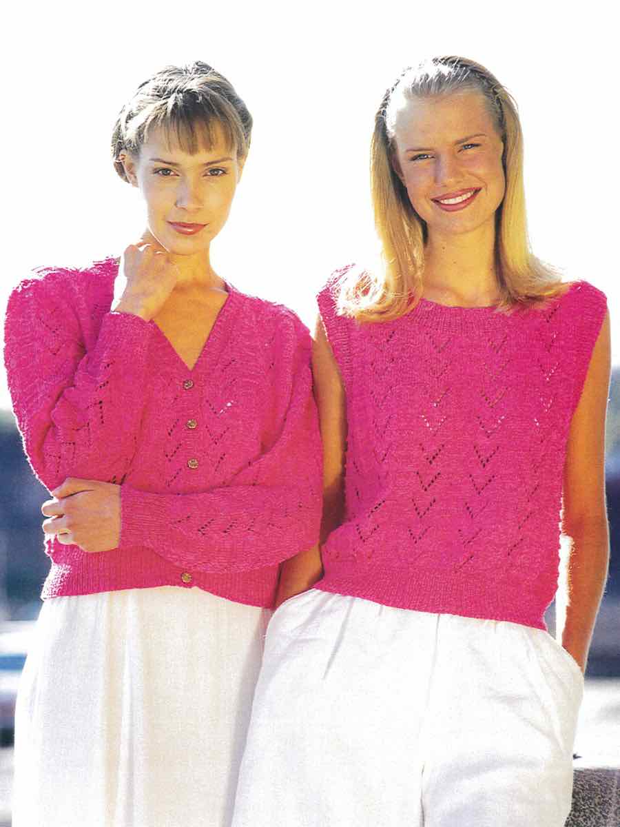 Koftan och toppen stickas i ett vackert hålmönster enligt diagram. Bakstycke och framstycken stickas separat med formning för ärmhål och hals. Ärmarna stickas för sig i samma mönster.