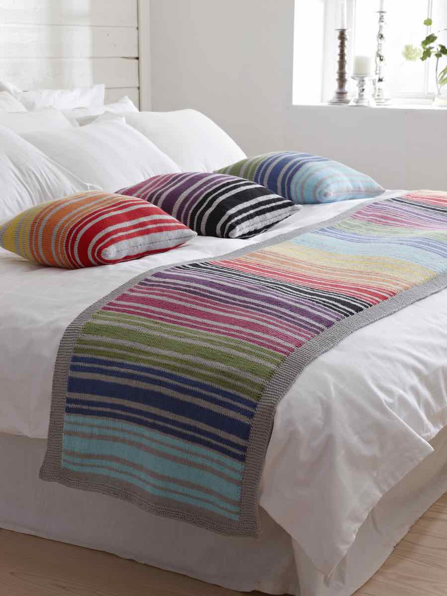 Sticka kudde och bedrunner i randigt med slät- och rätstickning. Kudden stickas runt på rundsticka, bedrunner platt med kantmaskor i rätstickning.