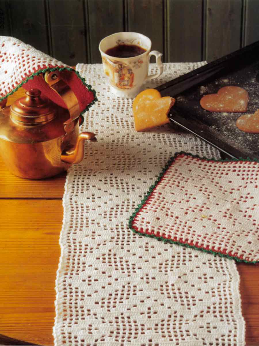 Virka en löpare och grytlapp i vackert hålmönster. Följ diagram och instruktioner med stolpar, luftmaskor och picot. Delarna virkas separat och sys ihop till ett dekorativt set i bomullsgarn.