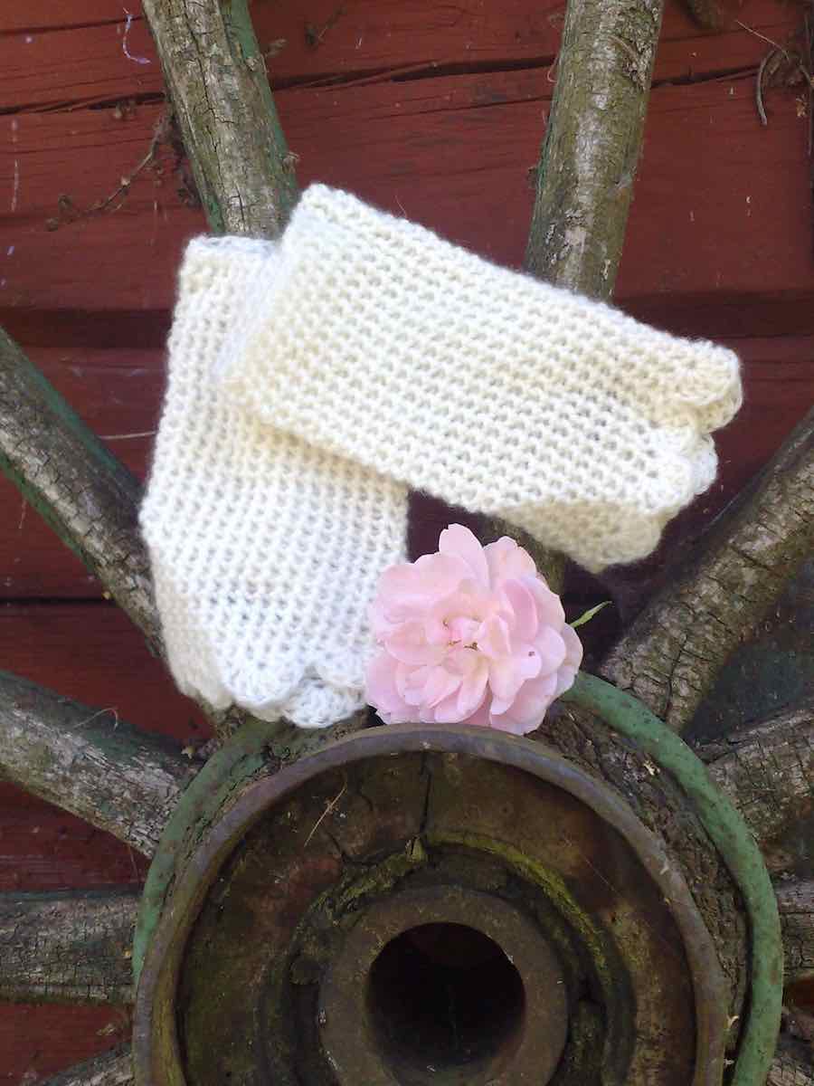Pulsvärmarna virkas runt med fasta maskor i främre maskbågen för en elastisk struktur. Efter 11 cm virkas tumöppning med luftmaskor, därefter fortsätter arbetet rakt. Avsluta med spetskant i stolpar och sy fast pärlemoknappar.