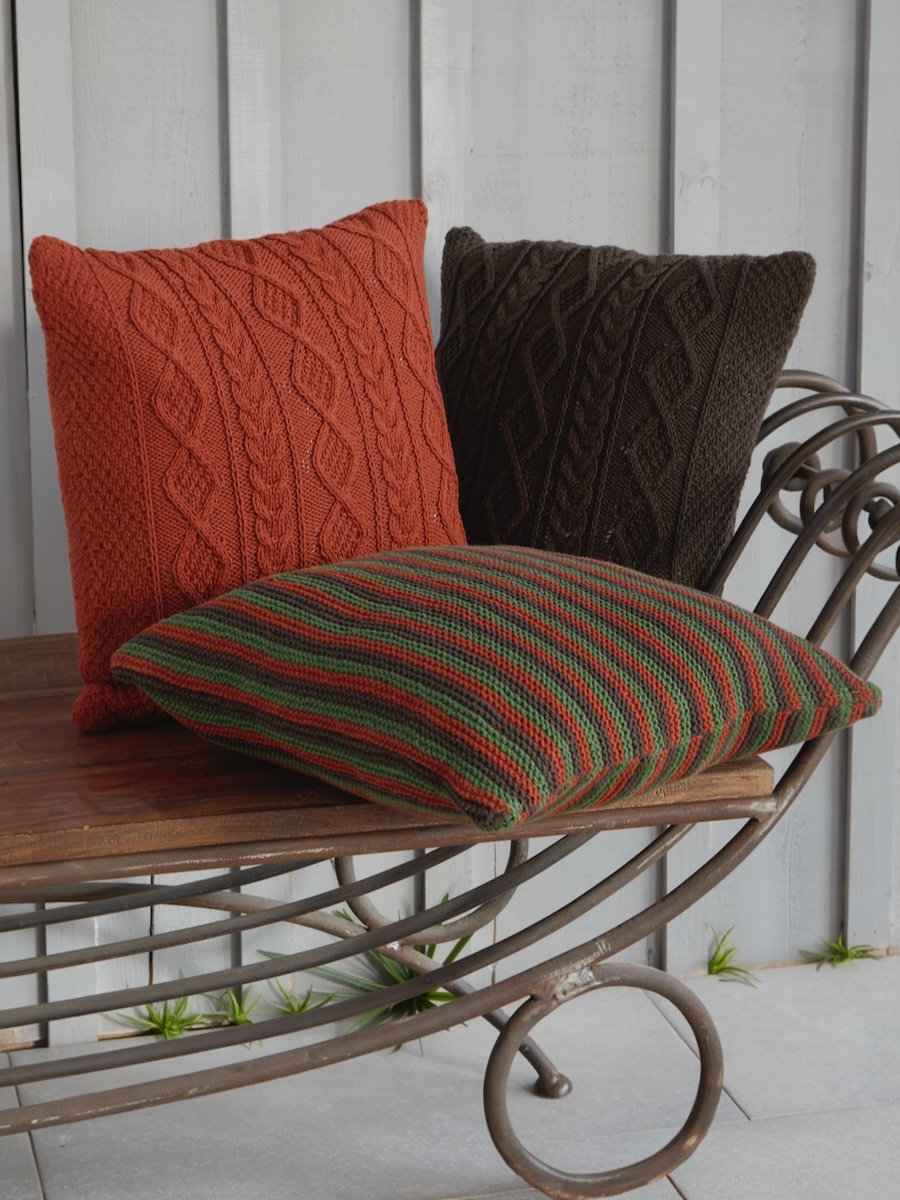 Sticka en kudde i rätstickning med färgade ränder eller mönstersticka med flätvridningar. Formen sys ihop runt en innerkudde för ett dekorativt och mjukt tillskott till soffan.