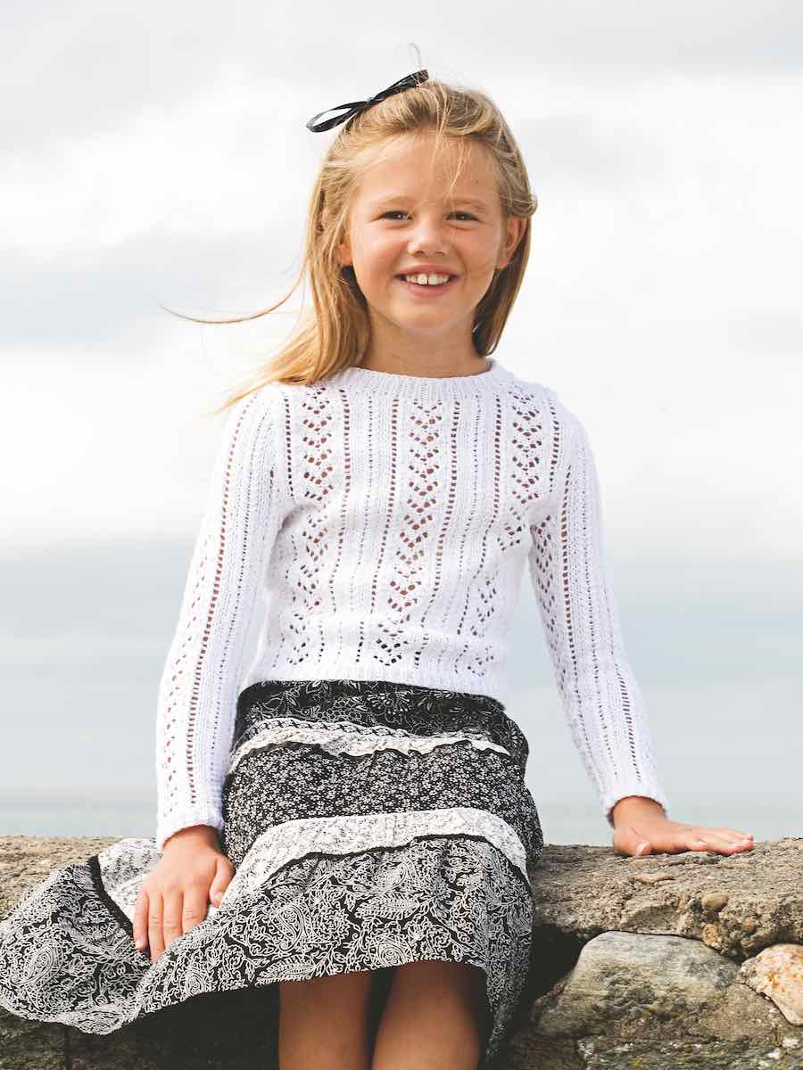 Den spetsstickade jumpern stickas nerifrån och upp i delar med mönster enligt diagram. Arbetet formas med ökningar och raglanminskningar. Delarna sys ihop, halskanten stickas i resår och sys fast.