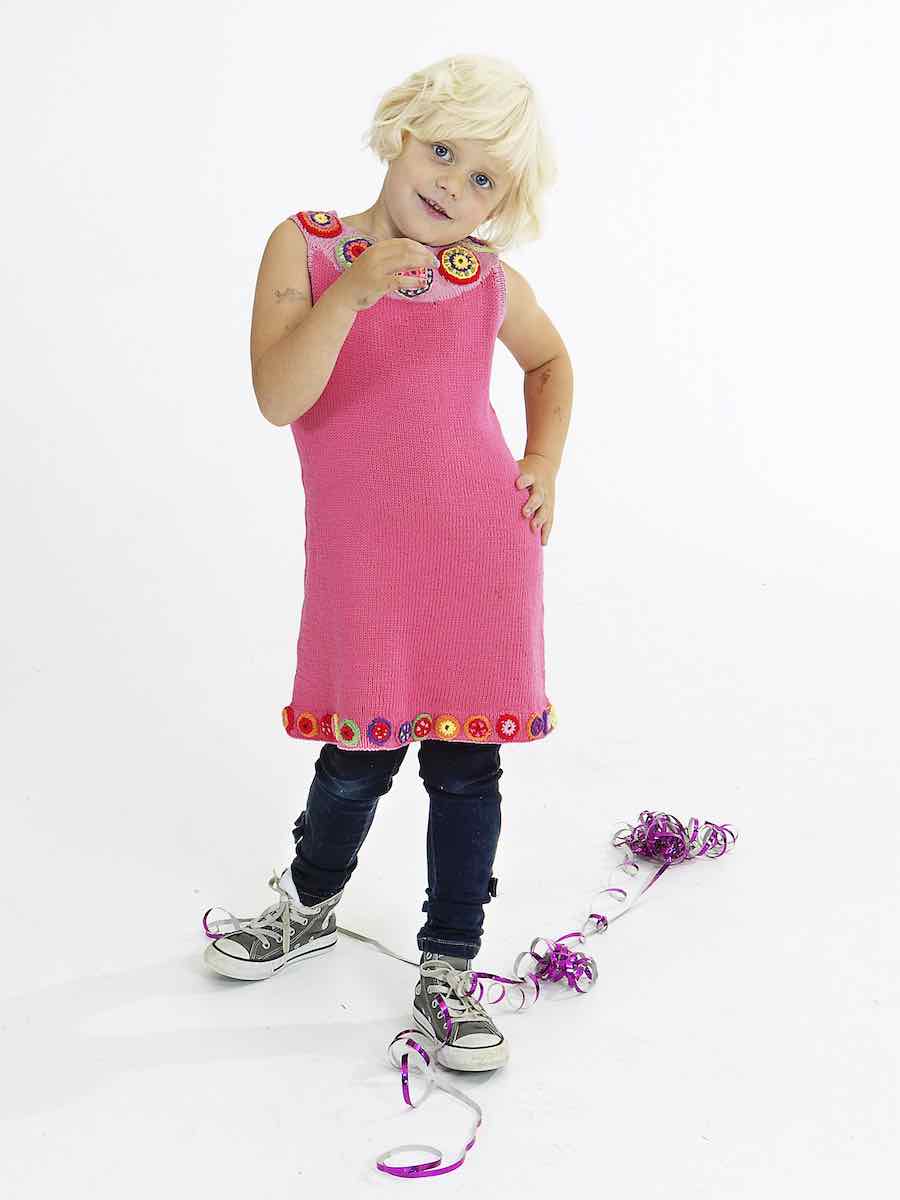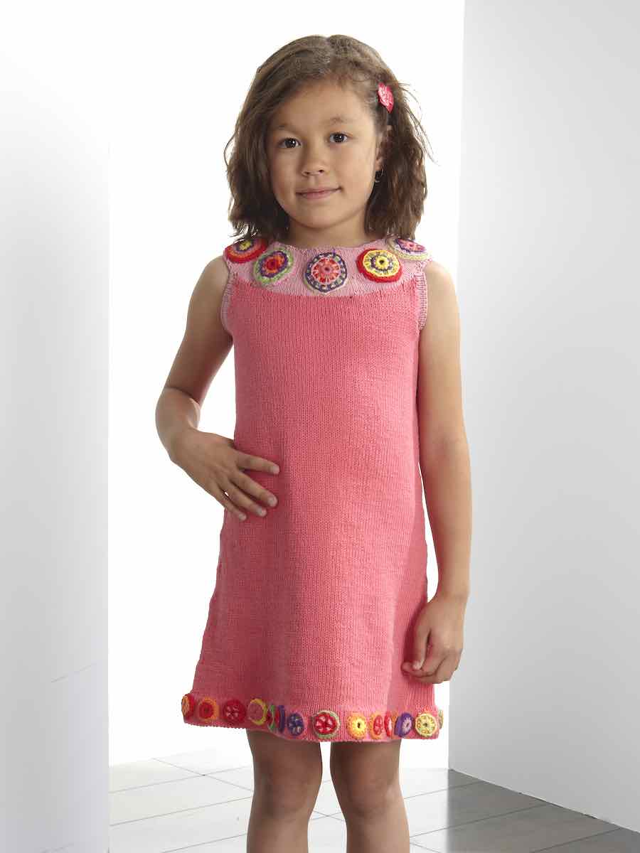 Sticka en färgglad barnklänning i bomull i ett stycke på rundsticka med formande minskningar och virkad vikkant. Dekorera med virkade cirklar i flera färger och broderade blommor.