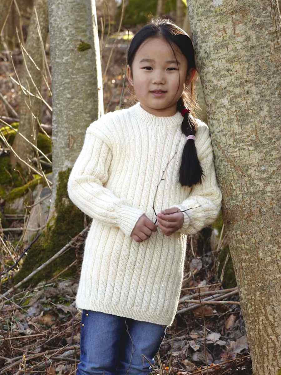 Barntröja som stickas i resår och mönsterstickning med ränder. Fram- och bakstycke samt ärmar stickas separat, formas med hals- och axelavmaskningar, sys ihop och avslutas med resårkant runt halsen