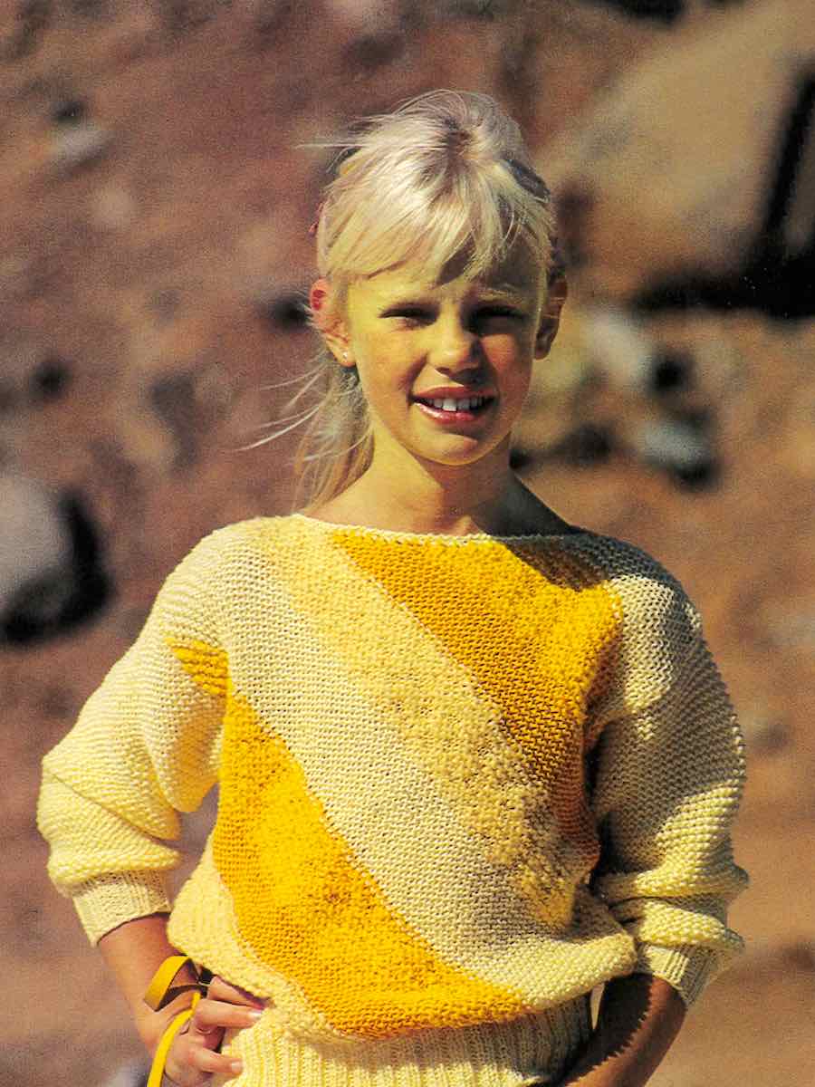 En barntröja som man stickar på diagonalen, riktigt effektfullt.
