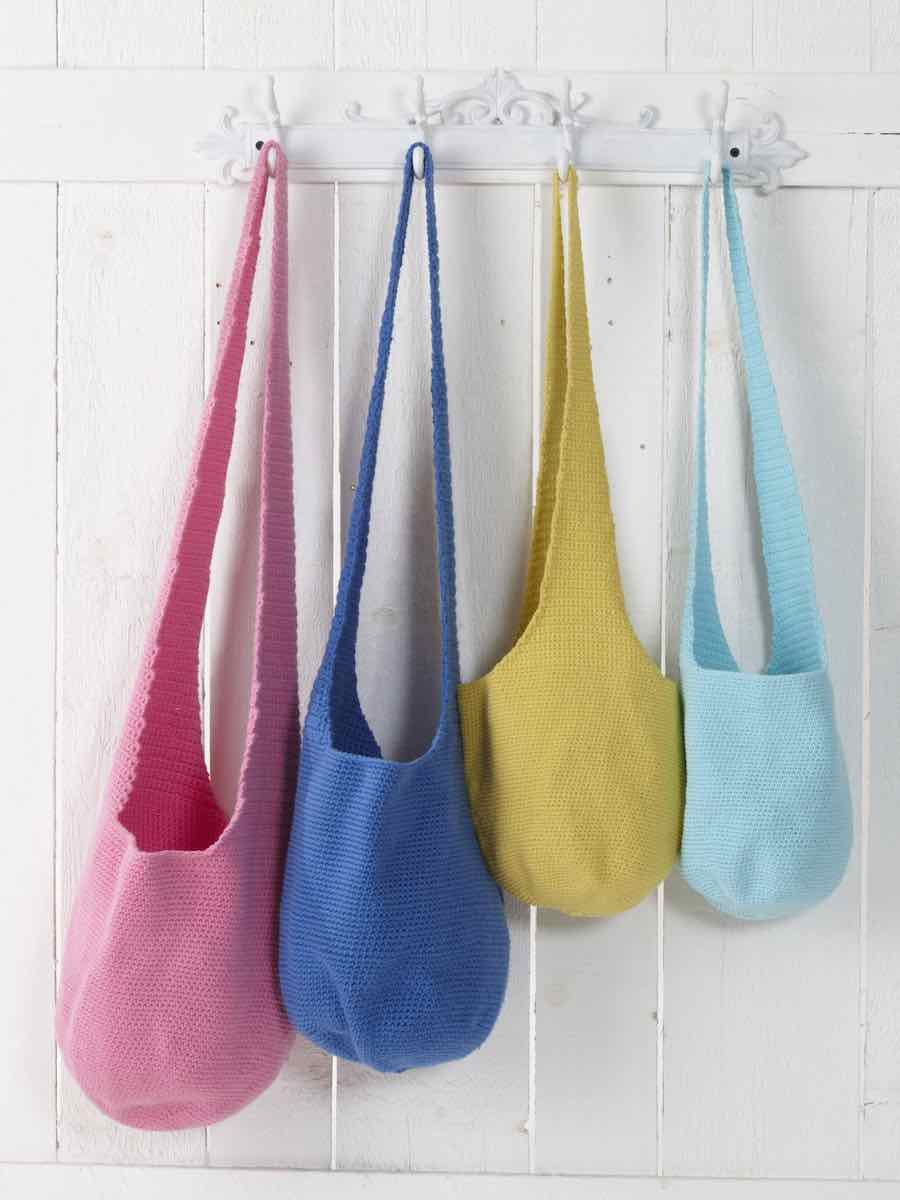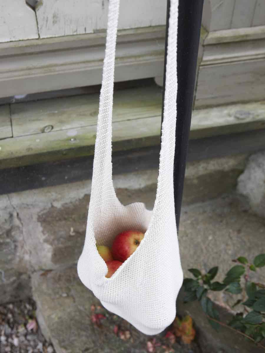 Virka en rund väska i bomullsgarn med fasta maskor från botten och upp. Öka maskor jämnt, virka runt i spiral och forma axelremmar med minskningar. Remmarna virkas till önskad längd och sys ihop